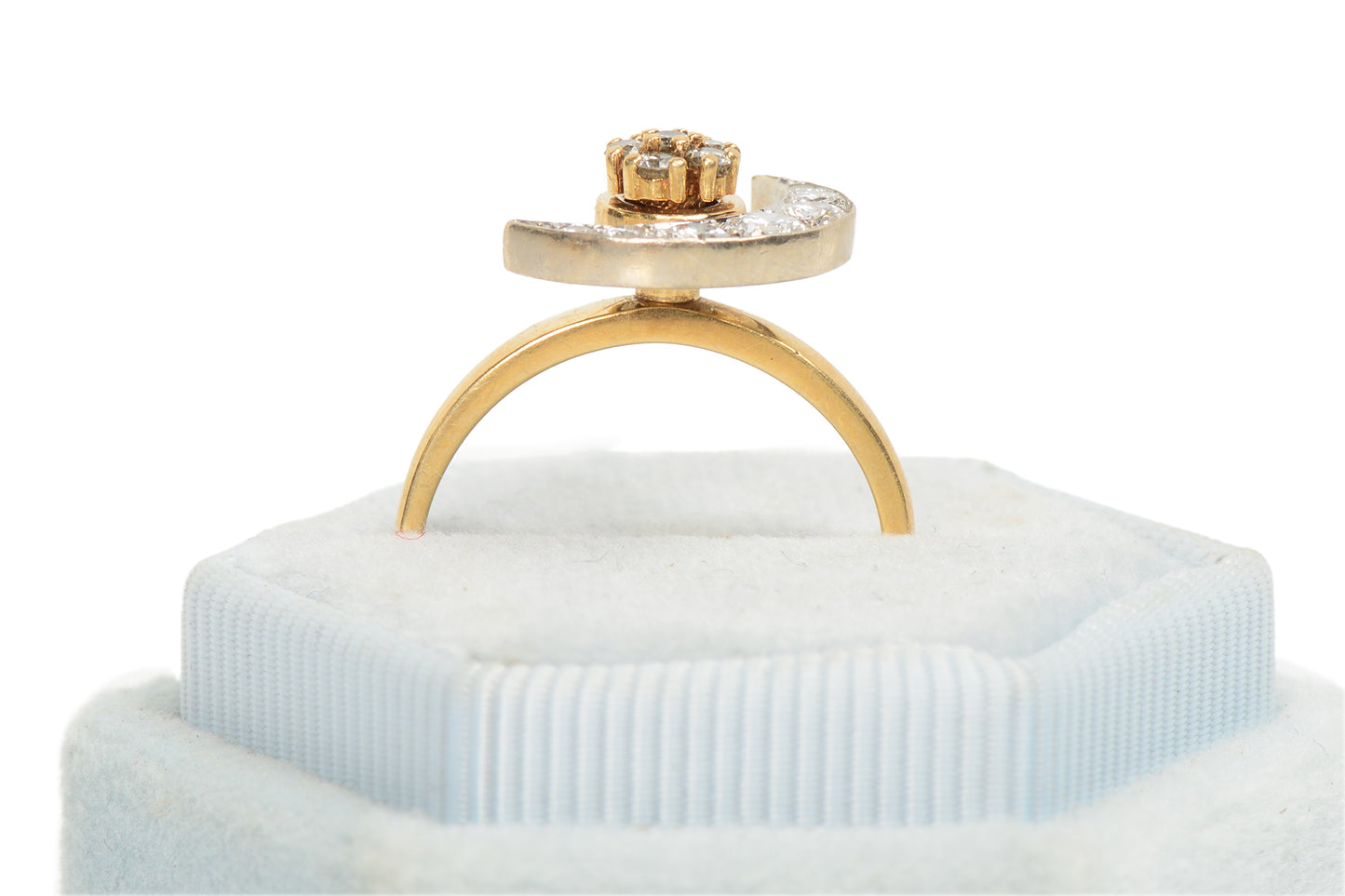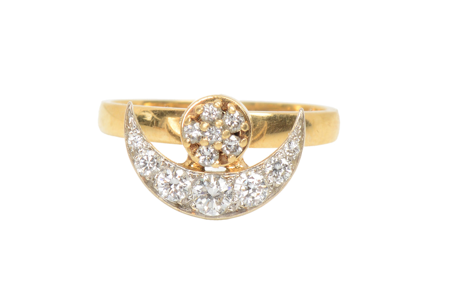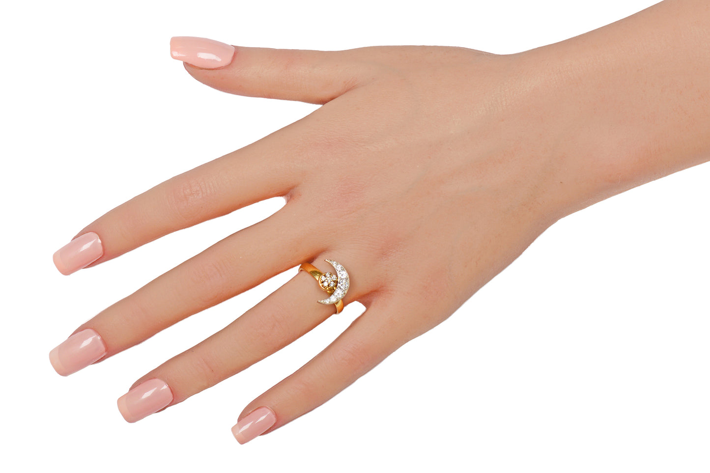 The motif is a crescent moon orbiting around a twinkling star. All in fine, brilliant cut diamonds, the moon spins with every flick and gesture of the hand, spinning around the center.