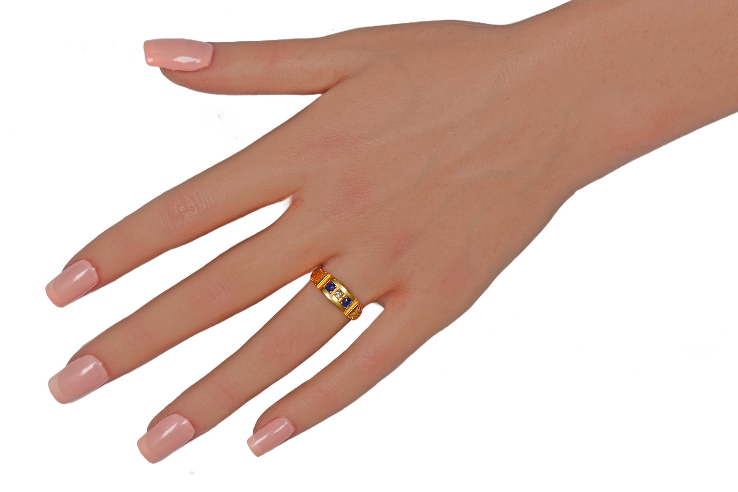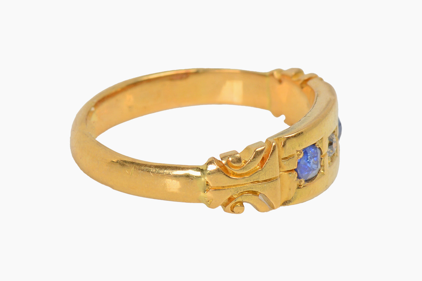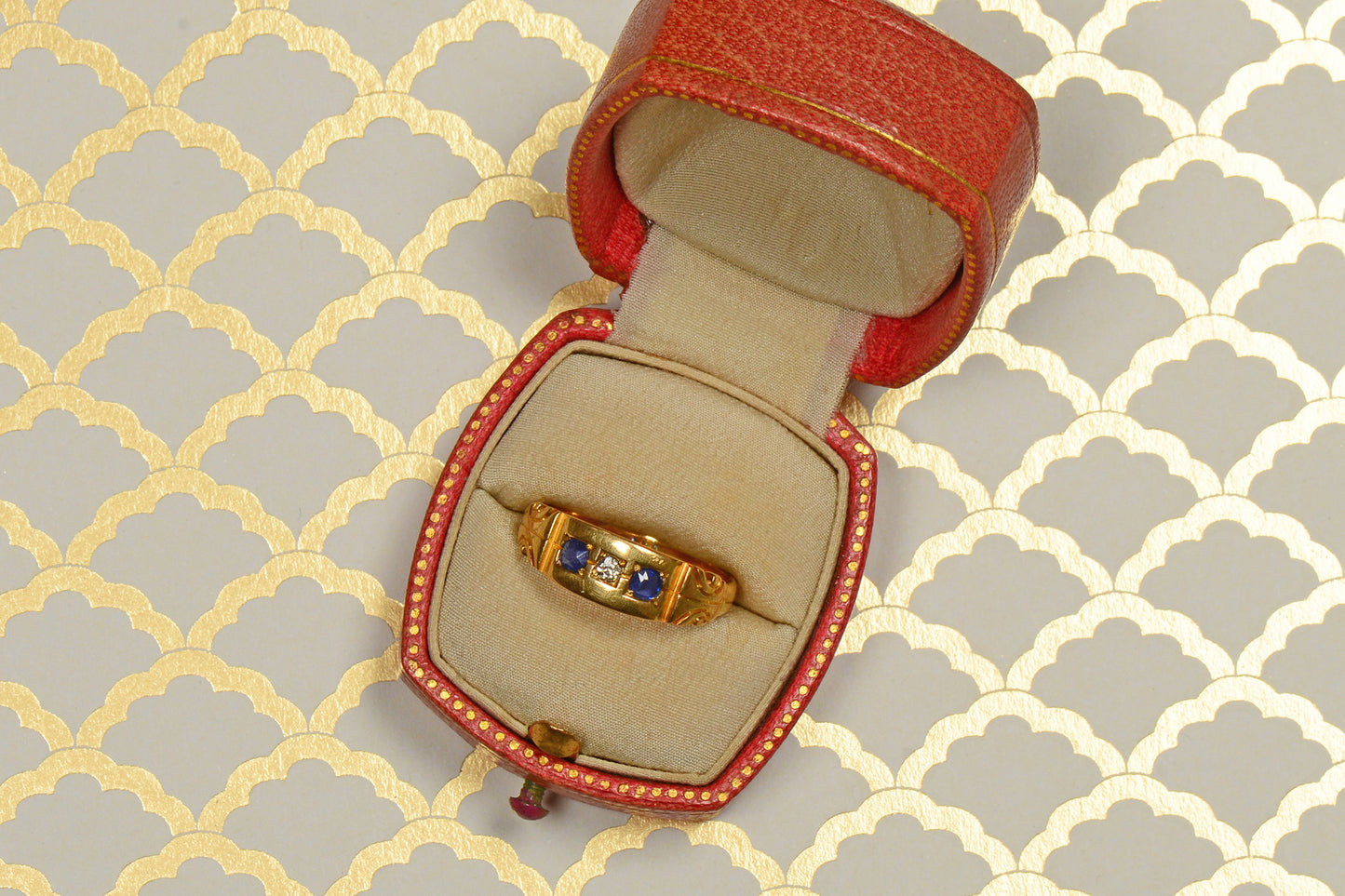 Two sapphires flank a diamond and are all gypsy set, or rest below the top surface of the radiant gold.