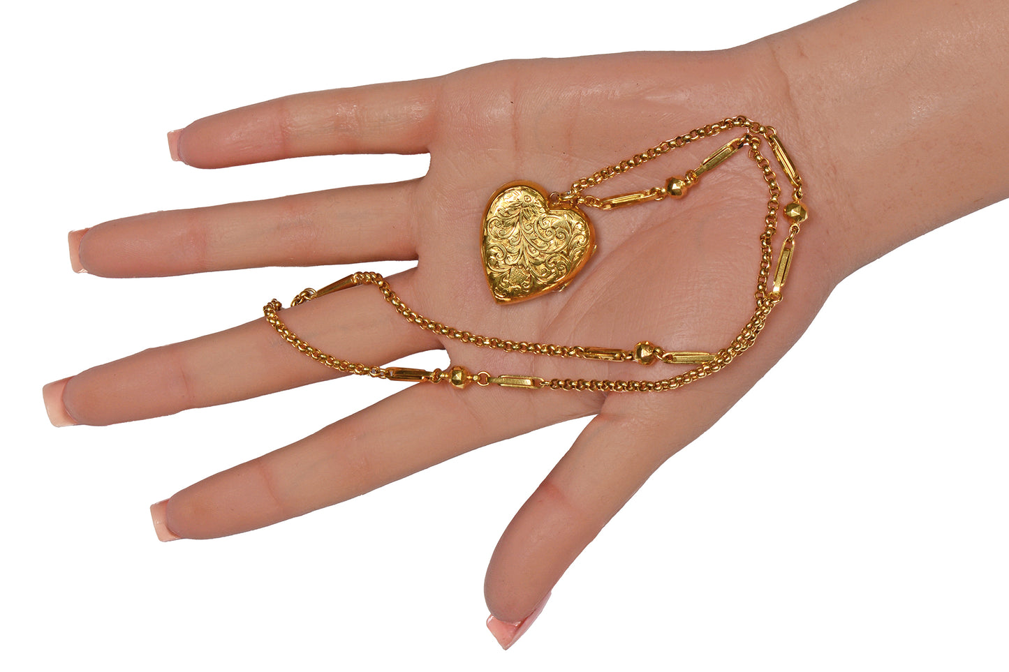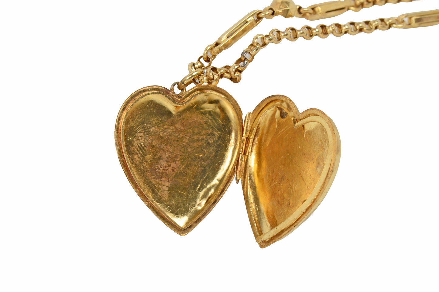 This says it all...a gold, finely hand-engraved heart motif locket is accompanied by an unique gold chain.