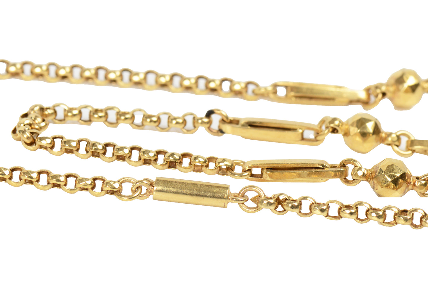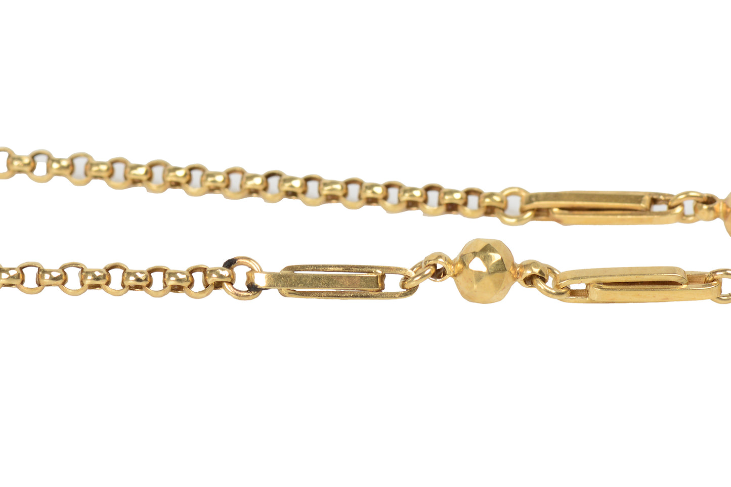 A gorgeous 18 inch chain alternates oval links with double long oval interlocked, flat links and sparkling faceted hollow orbs that catch the light.