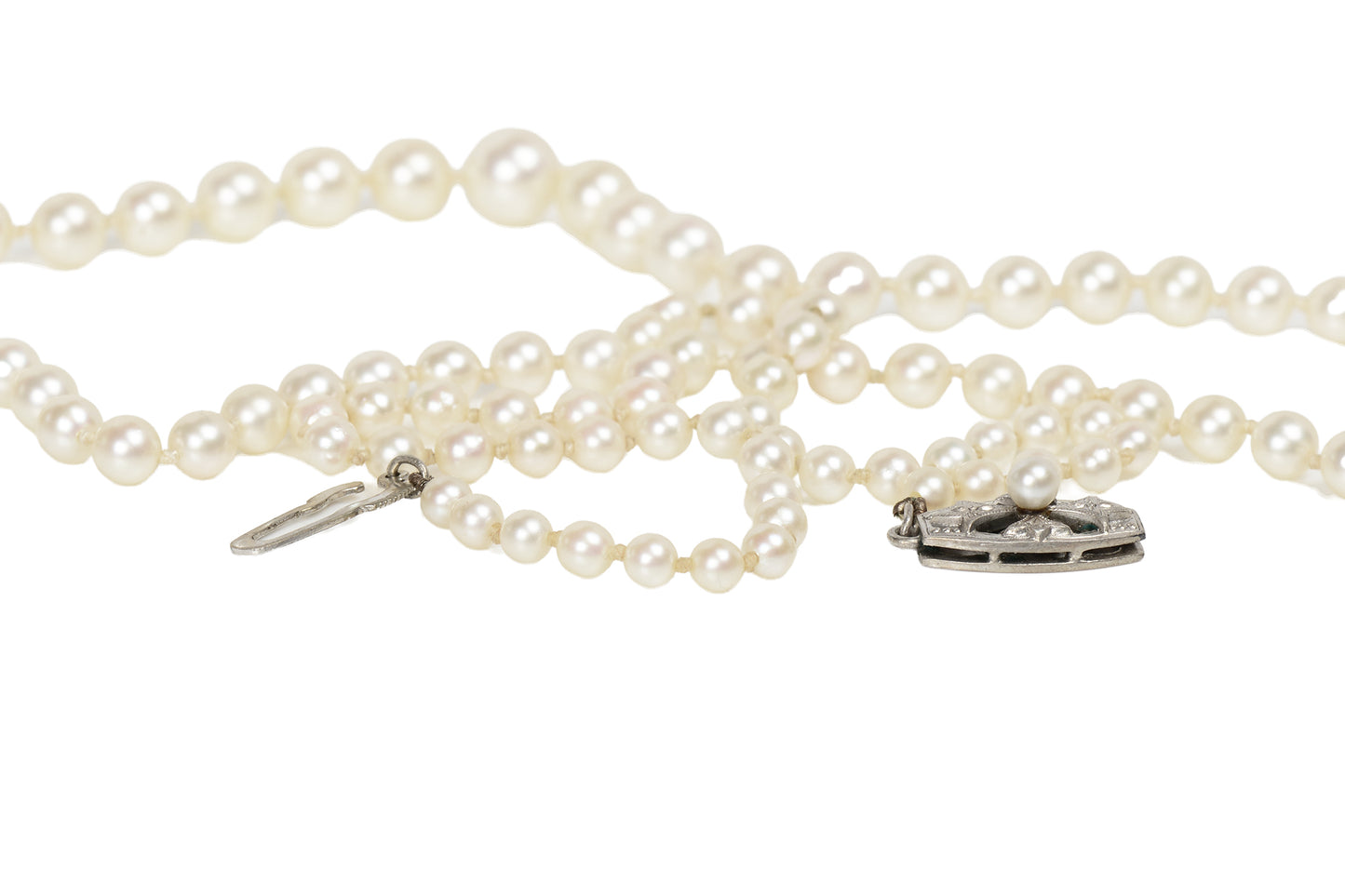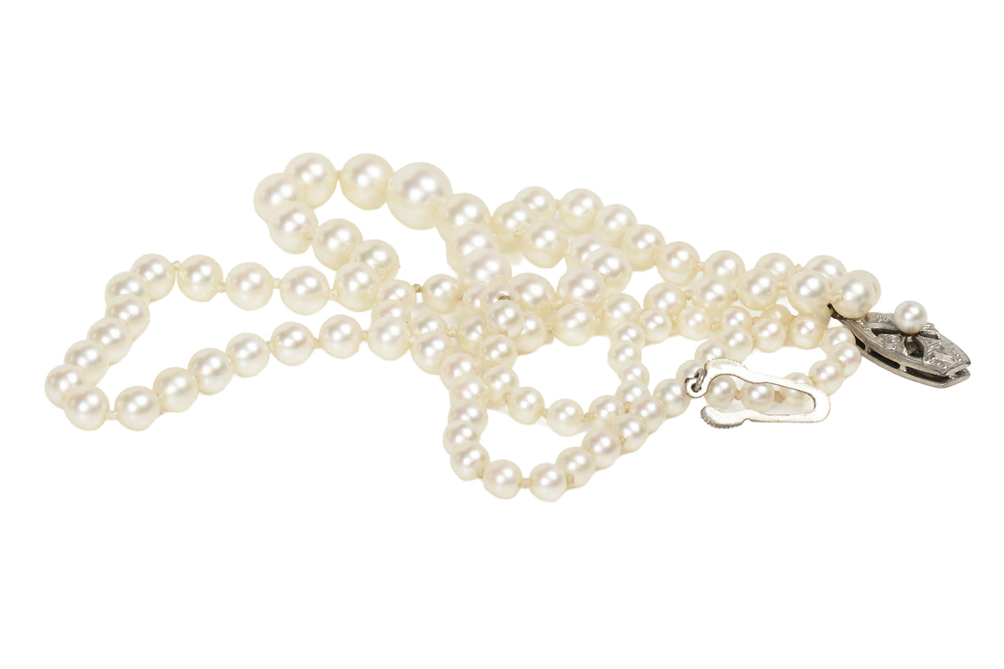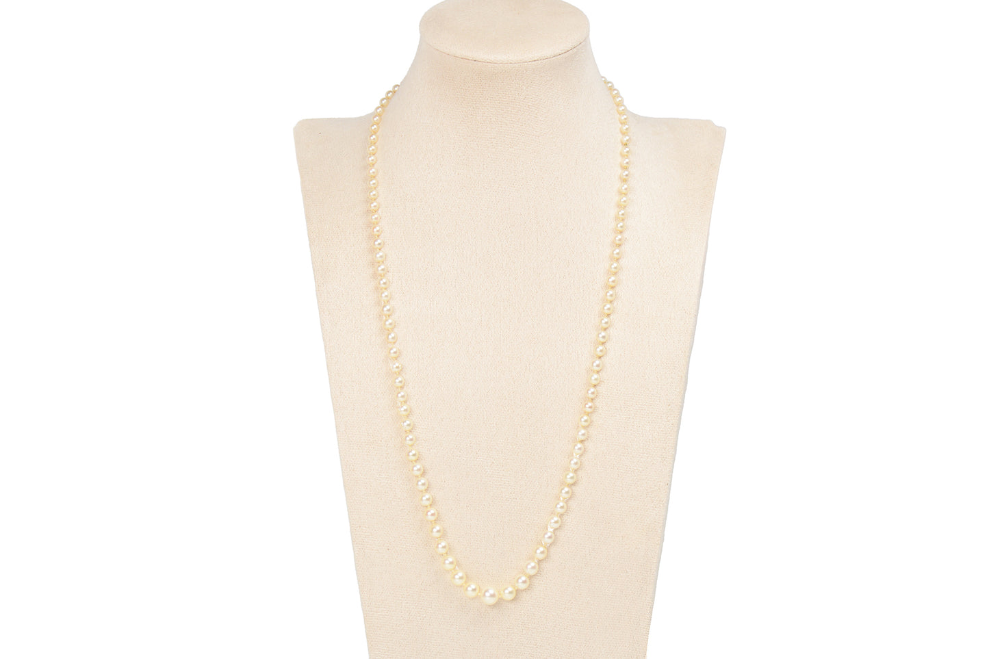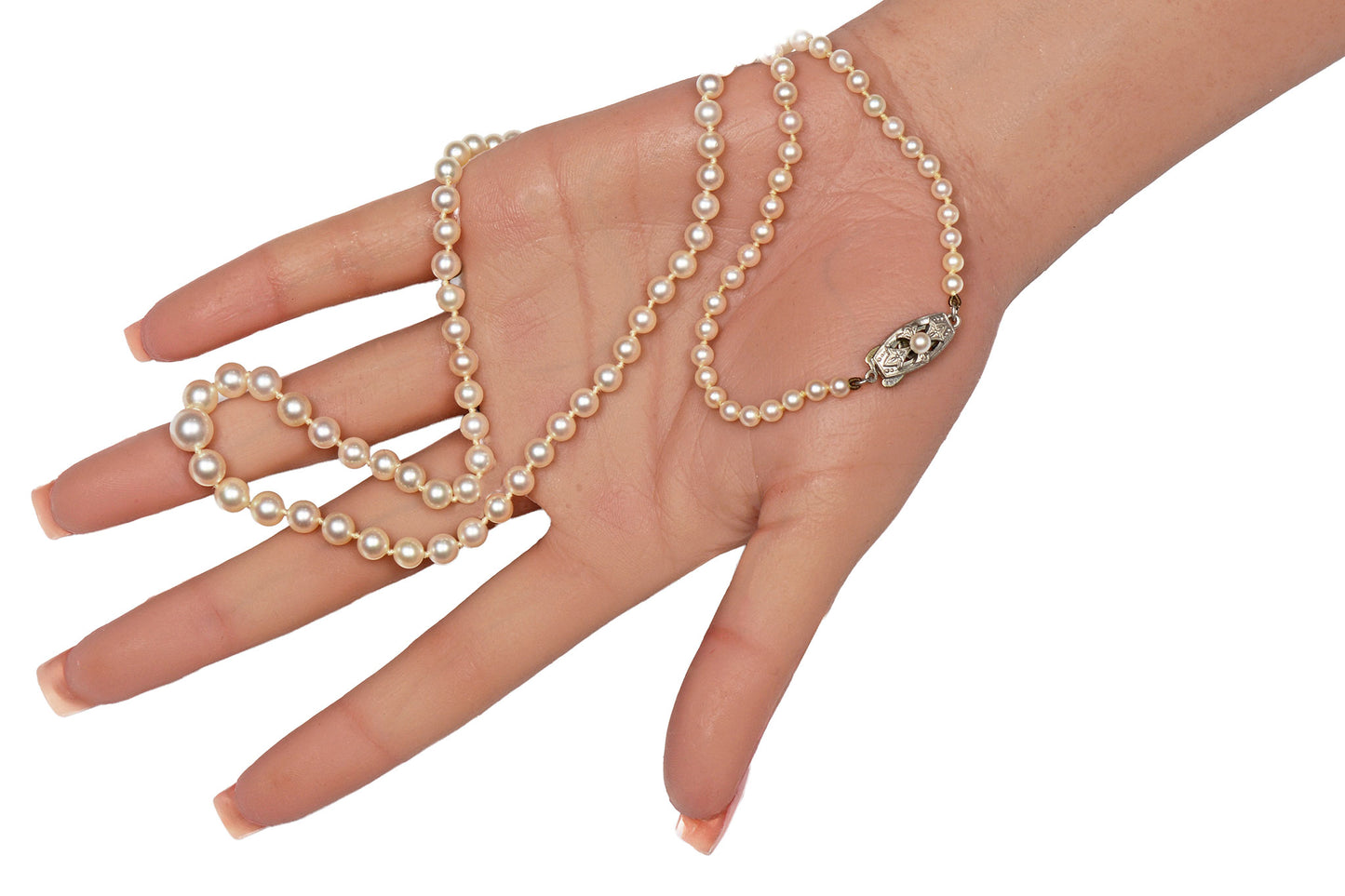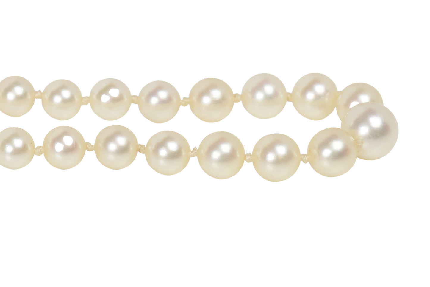 At 21 5/8 inches, this strand of subtly graduated pearls transitions from the largest at 7.2 mm to 3.4 mm, with most averaging 5.5 mm at the front area. These are individually knotted between.