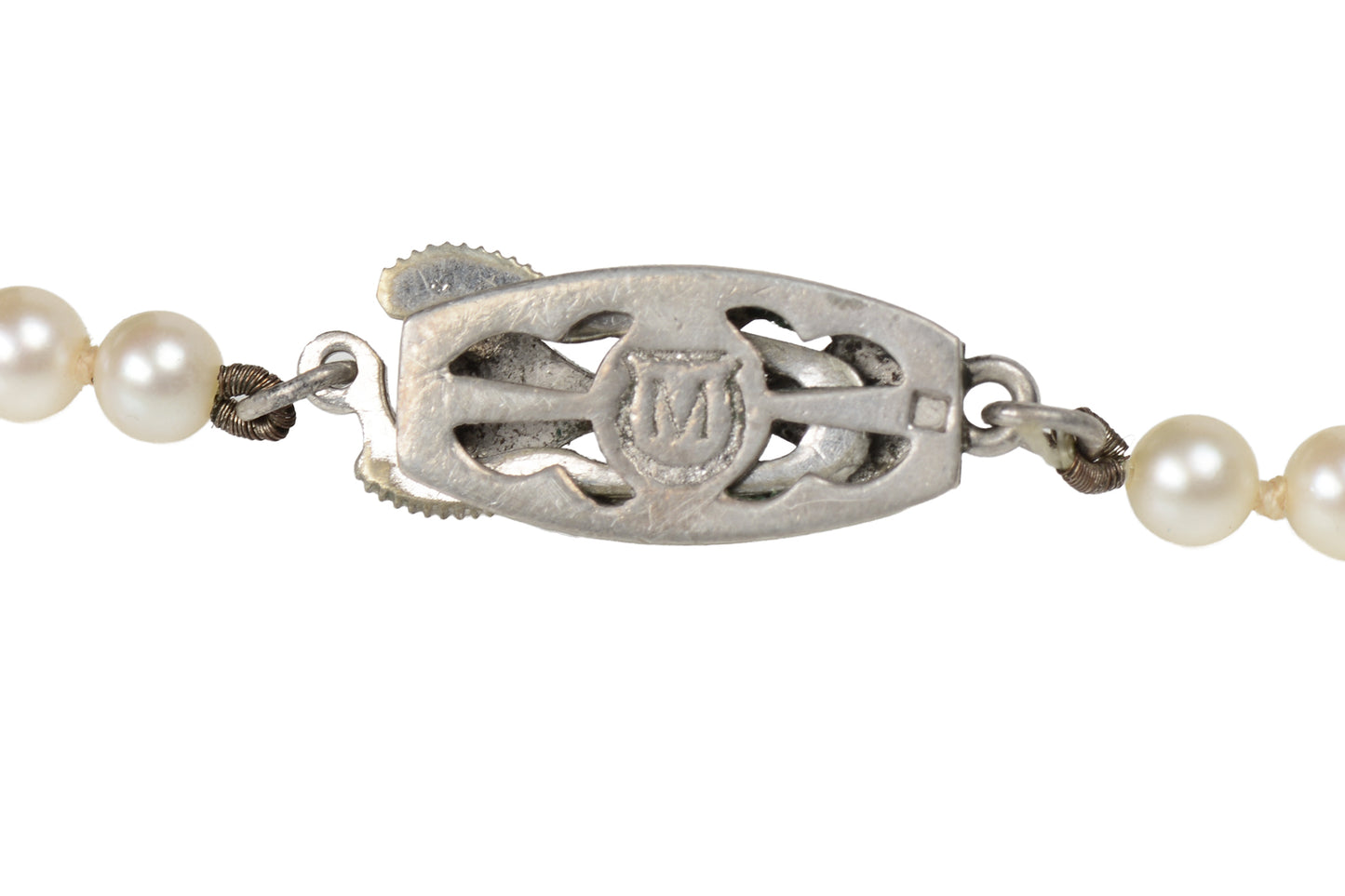 A sterling silver clasp is adorned with a single pearl of 3.4 mm and artful open-work and patterns surface designs to the silver. Naturally, the Mikimoto "M" is evident on its reverse.