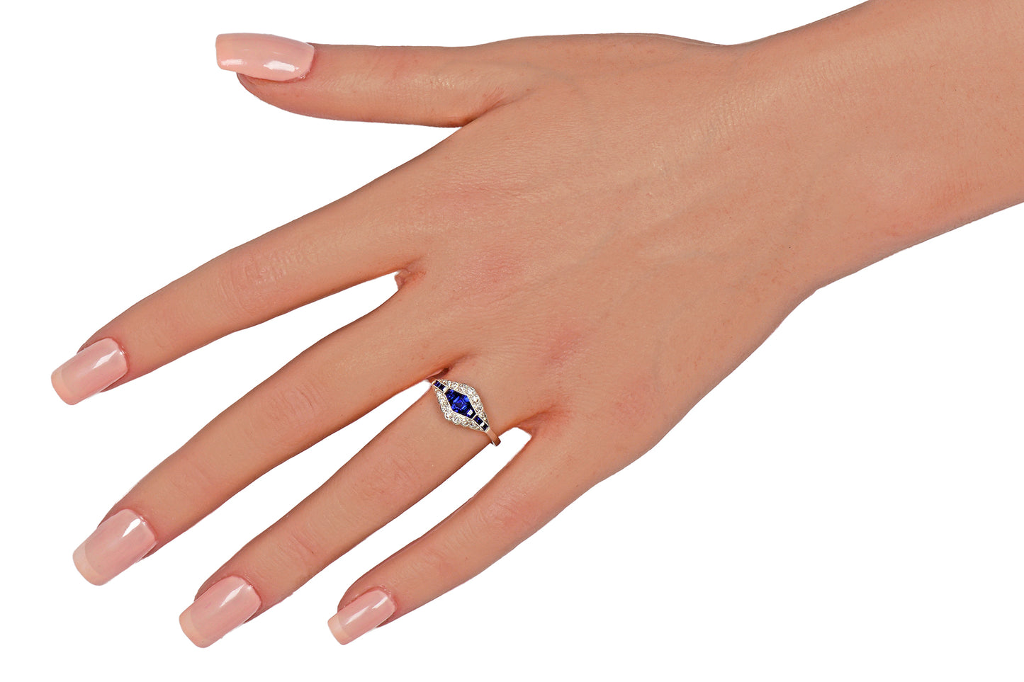 Those deep, royal blue natural sapphires play counterpoint to the icy white frame of diamonds.