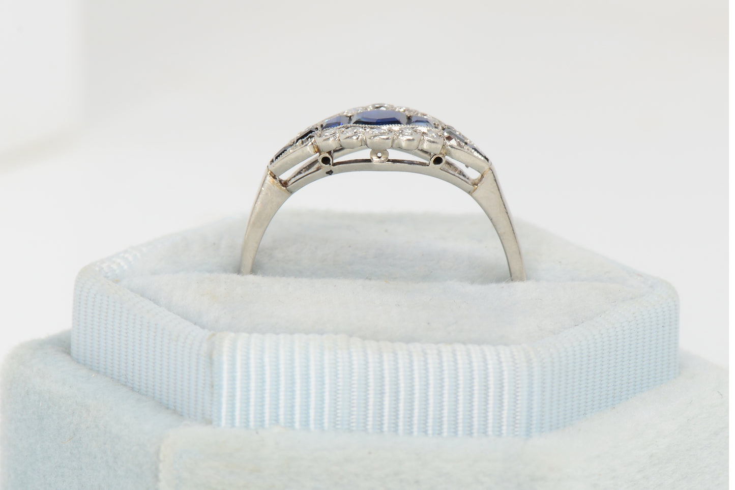 Low in profile, the sapphires are channel set and calibré cut with a scalloped perimeter that softens the angular center. All in platinum.