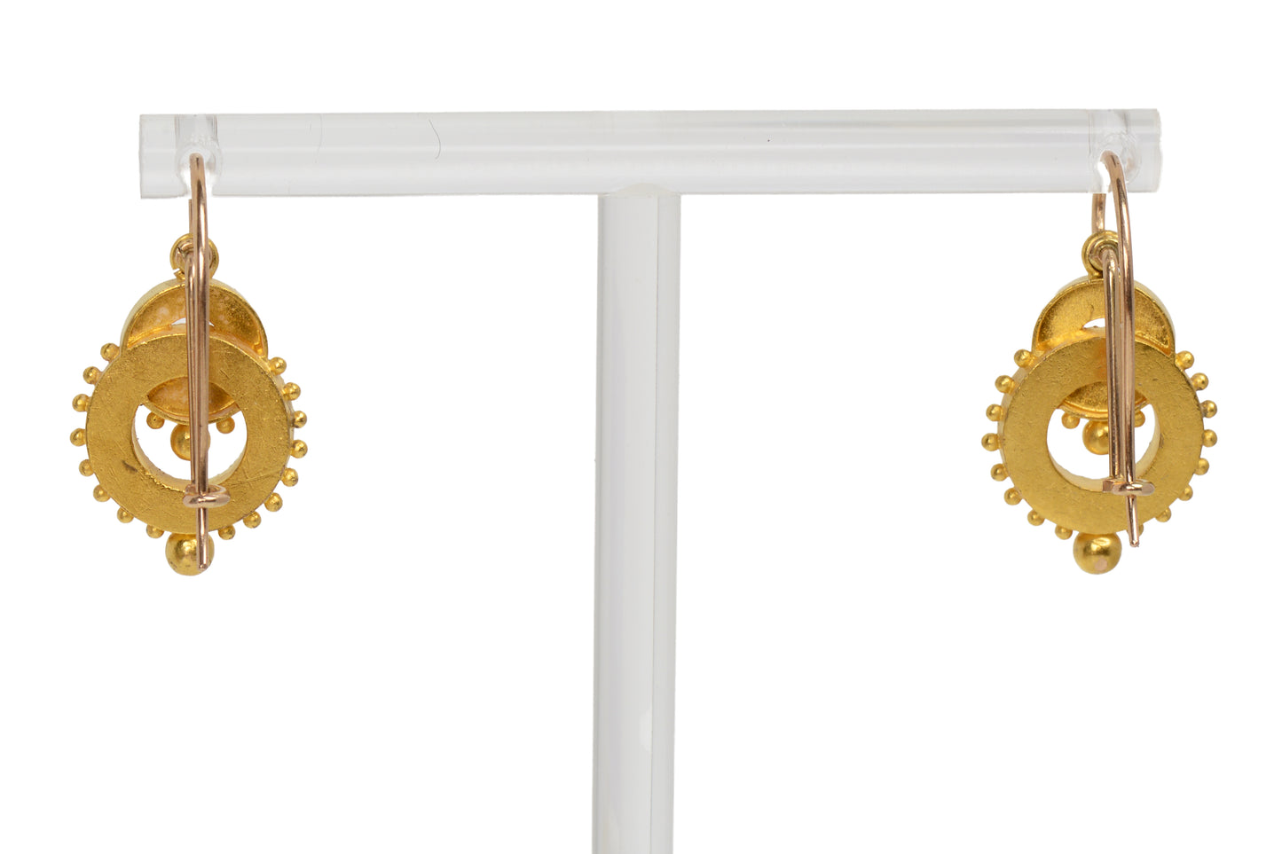 Cannonball gold trails along the outer edge of the bottom elements with a larger orb at the bottom tip. For security, the shepherds' hook ear wires slide in a "C" fitting, so these stay in place. Circa 1860, they are a perfect daily wear earring.