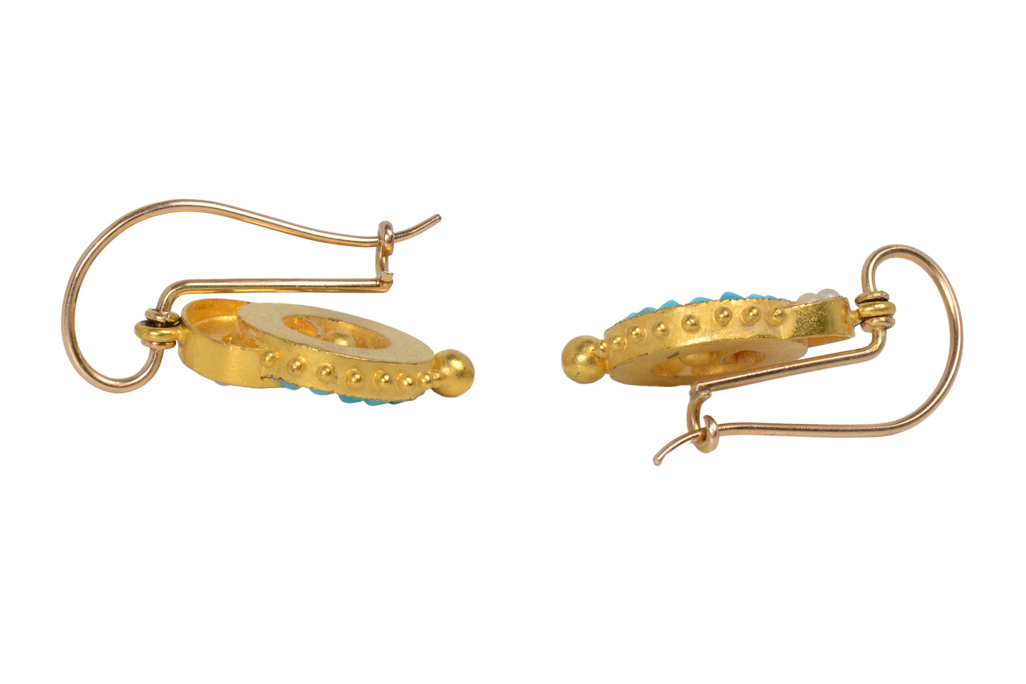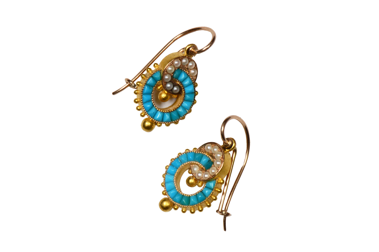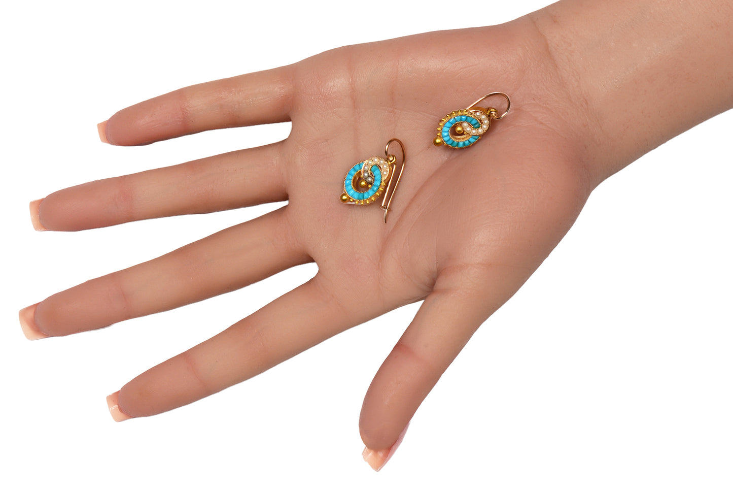 In superb condition, these short dangle earrings show off the best in natural seed pearls and turquoise.