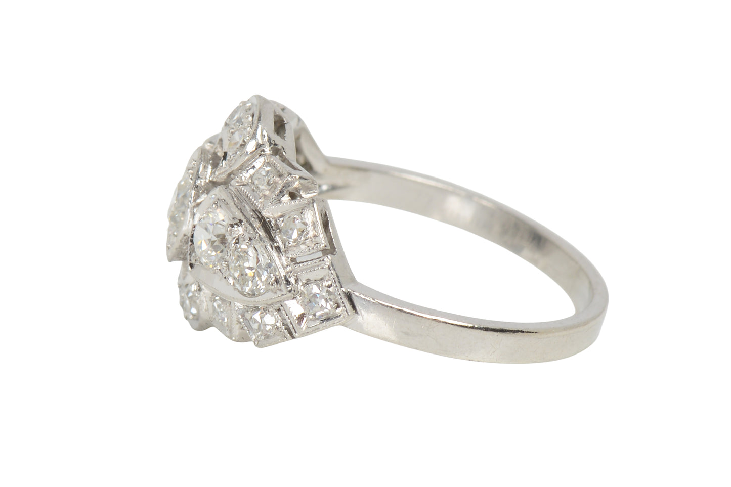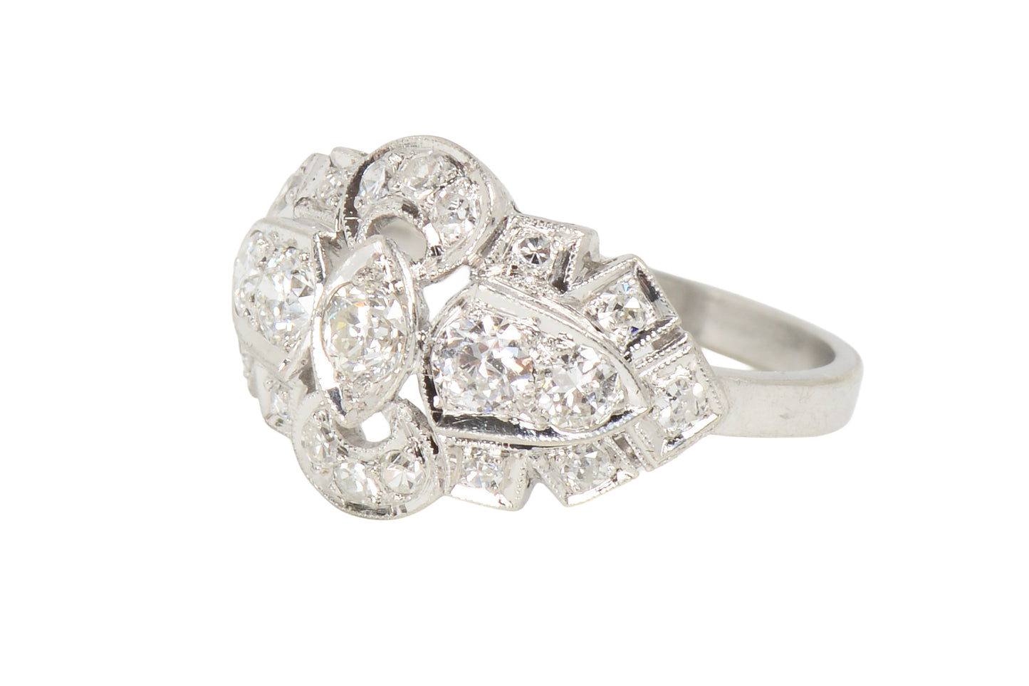 All in platinum, it is set with diamonds in a mounting that arches delicately across the finger, resting low for easy wear. Scalloped and shapely, the outer edge blends curves and angles the transitions to open areas and a central horizon of more natural earth mined diamonds.