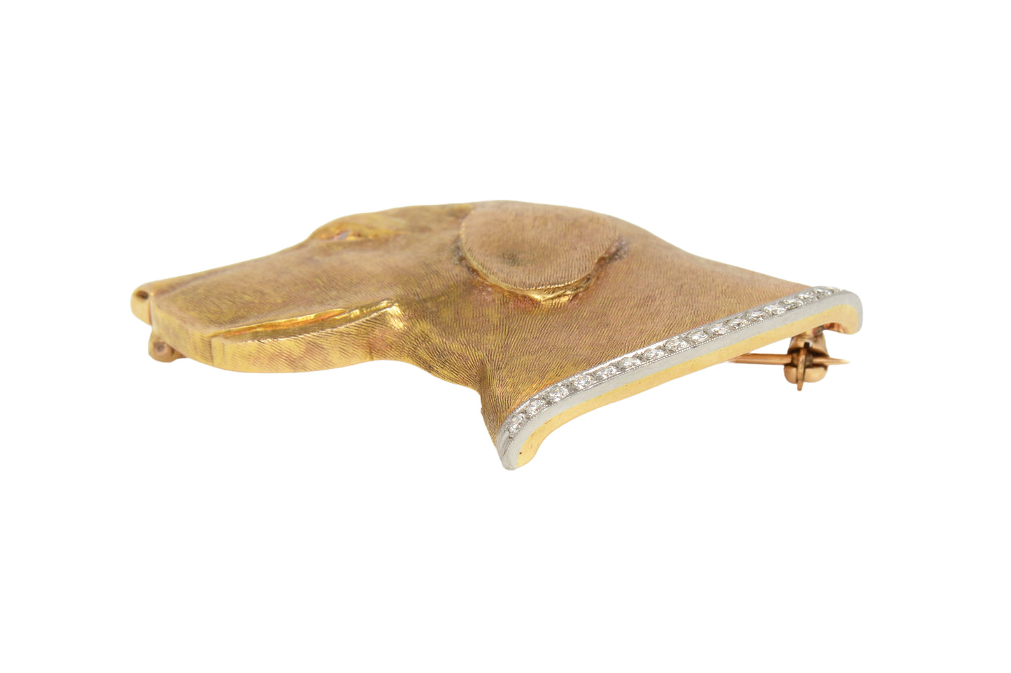 By the notable former firm of J.E. Caldwell, this vintage brooch is entirely handmade. It is modeled after a regal dog's head. Possibly a retriever, hound, or Labrador, the 14k gold surface is engraved with tiny lines to enhance the shading and chiaroscuro, bringing the jewel to life.
