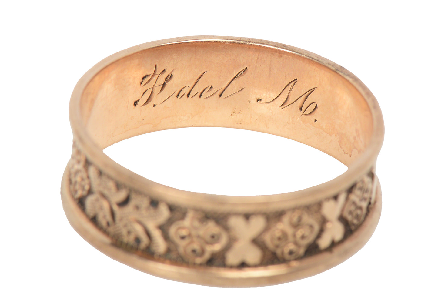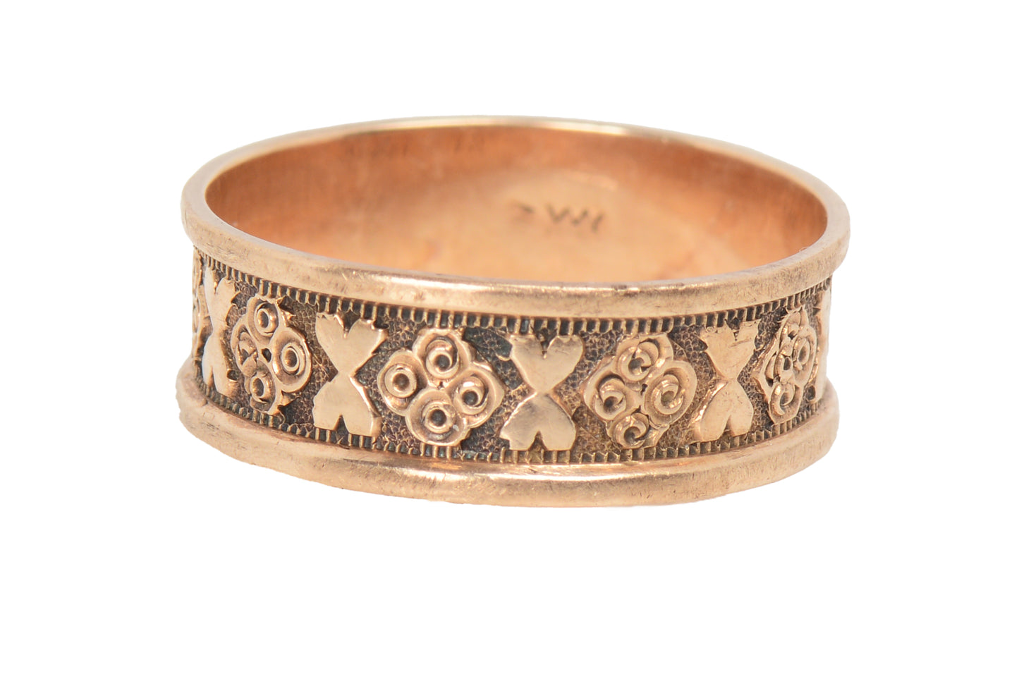Its is a ring with history and a story all its own, waiting for it to continue on in the years to come. Made of 10k rose gold, the band is edged top and bottom with double hearts and a four leaf or flower pattern between. It has a darkened, dimpled background to the design.