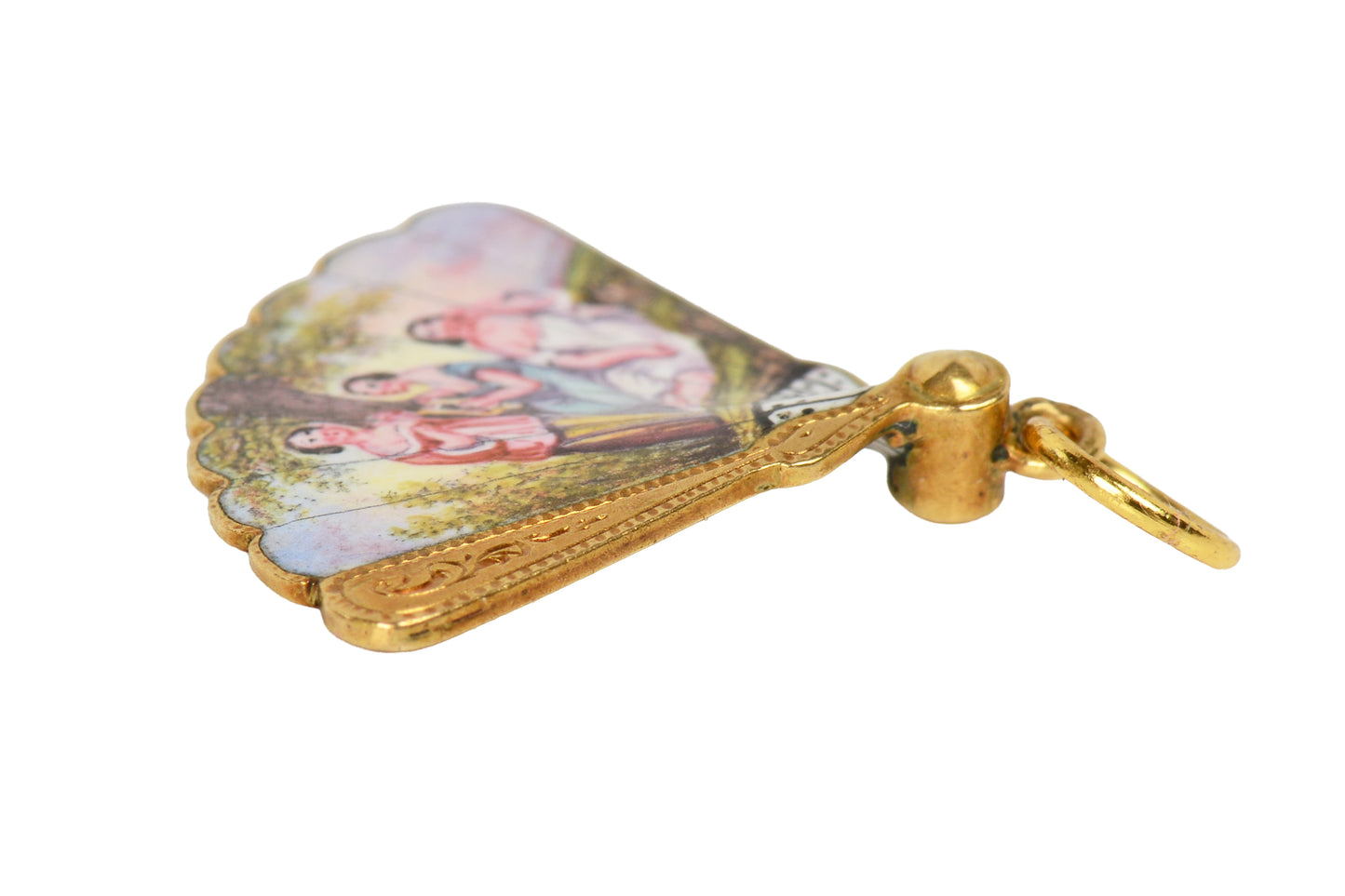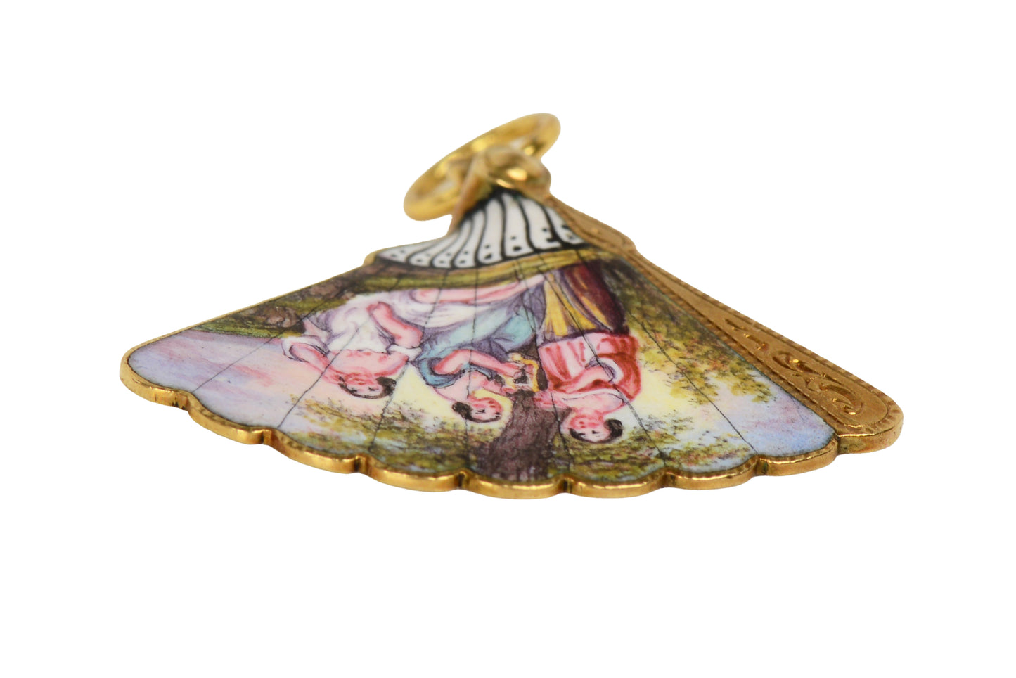 Originally this hung from a stickpin; and yes upside down, exactly as a fan would be carried. The Three Graces did not convert this to a charm or pendant, but purchased this as is. The original fitting and French hallmarks remain intact. Only a larger "O" fitting as added.