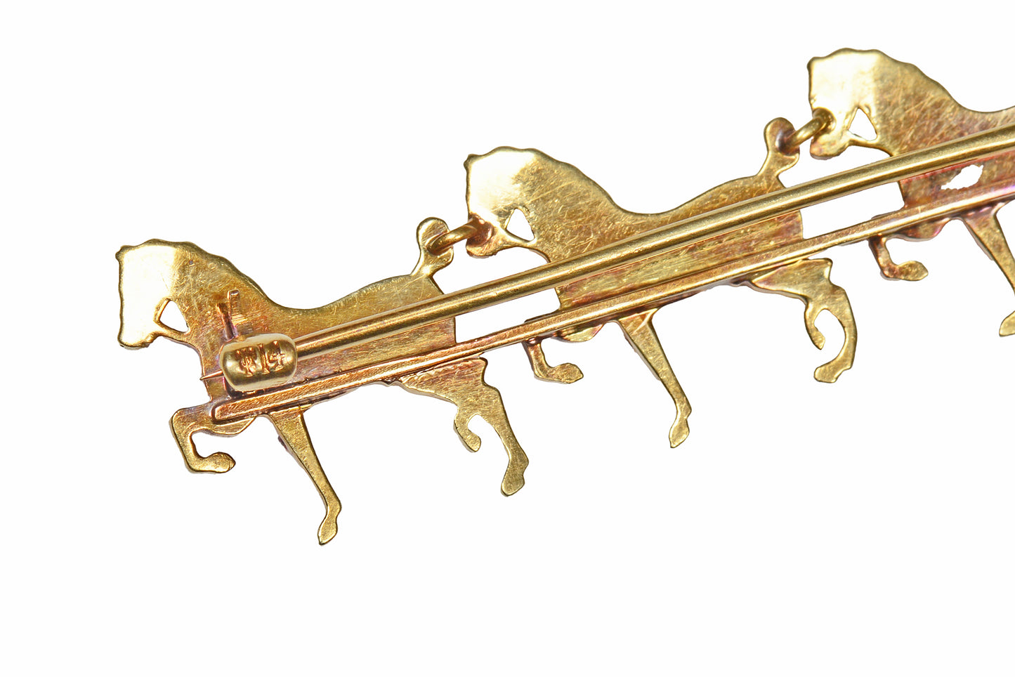 From the former prestigious firm of Sloan & Co. hails this horse motif gold brooch.