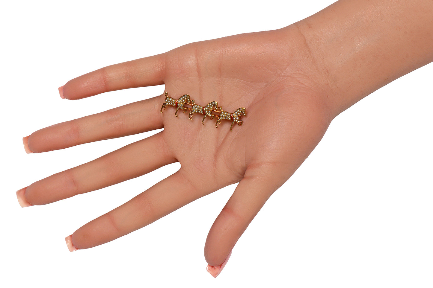 Crimson red enamel demarcates the bridle and the reigns or lines are in textured gold.