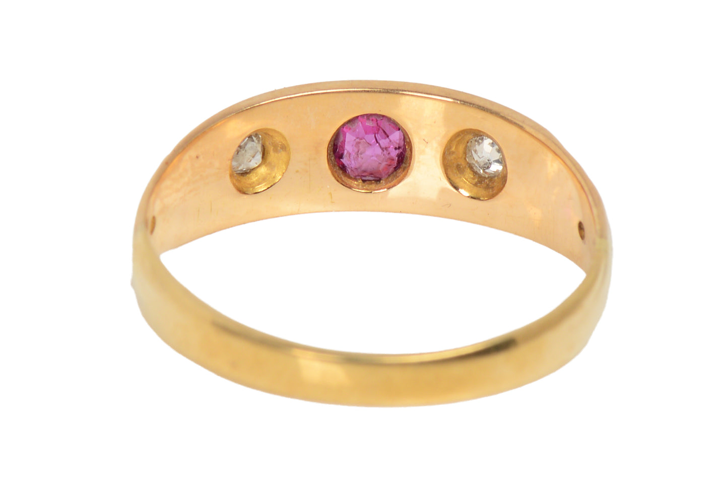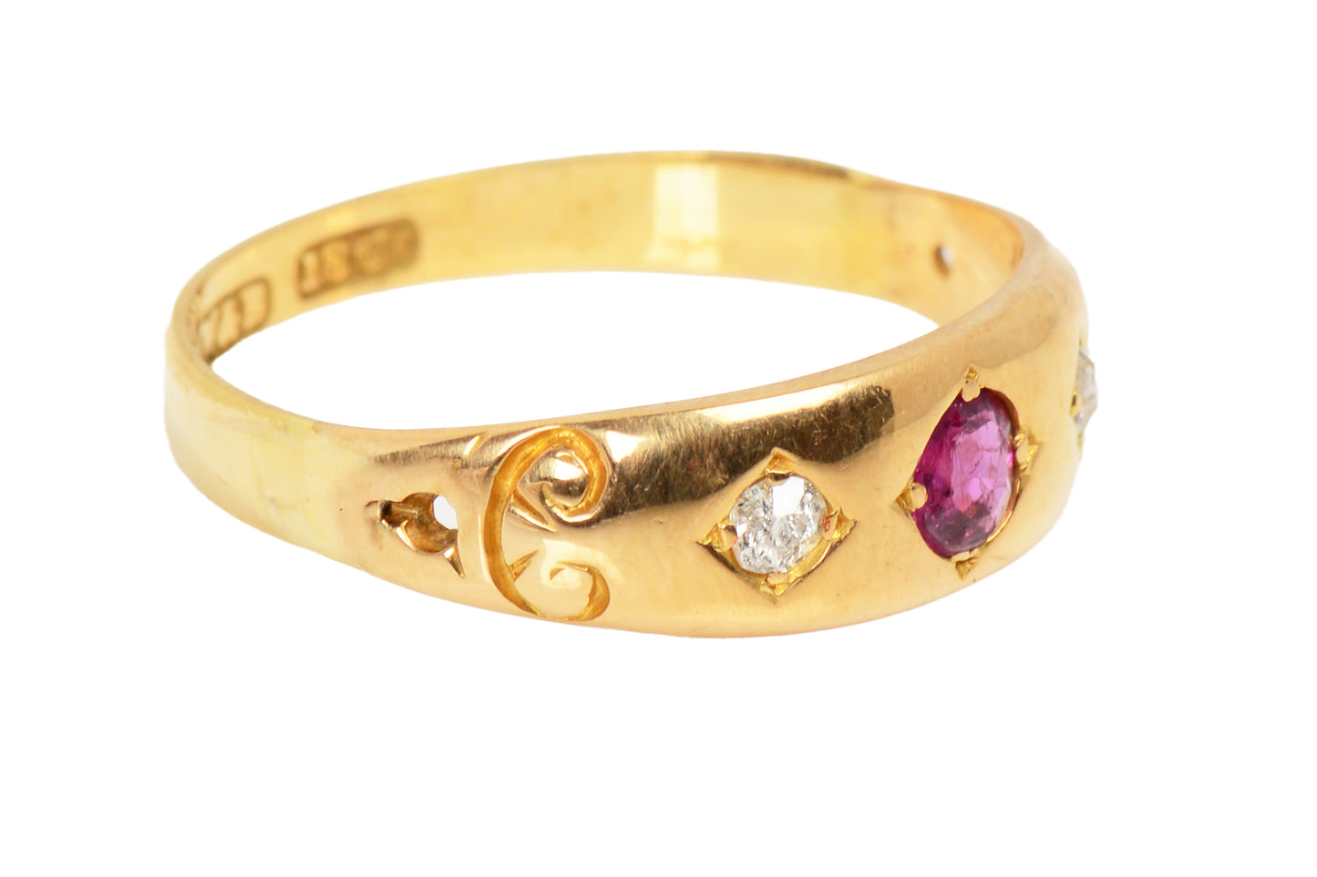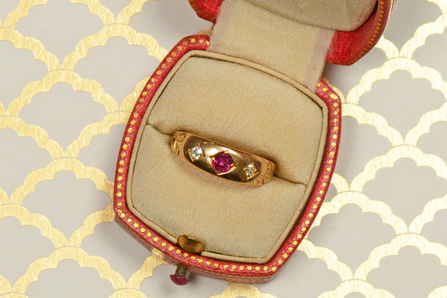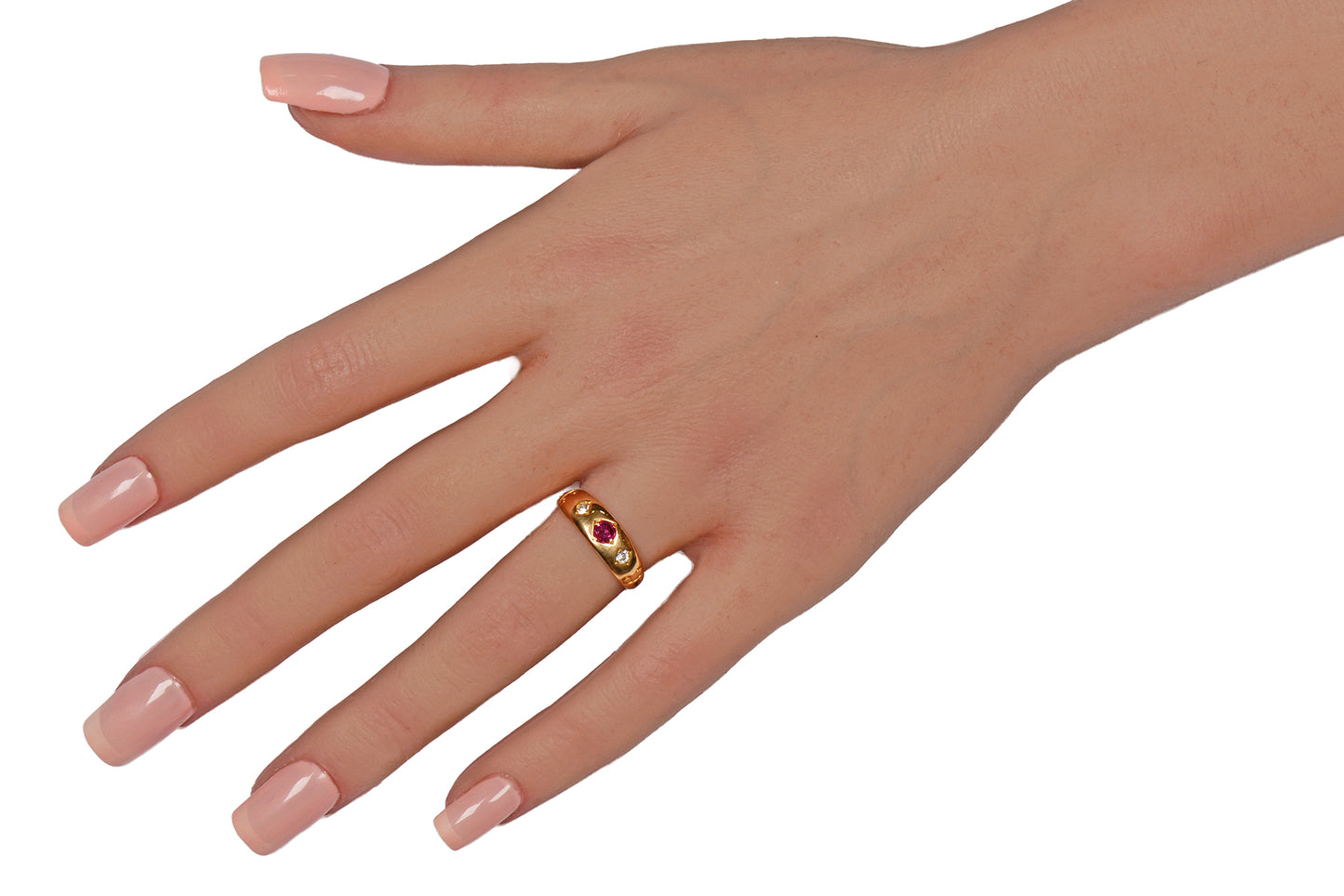 One vibrant ruby and two diamonds reside below the surface of the gold. This technique is referred to as gypsy setting.