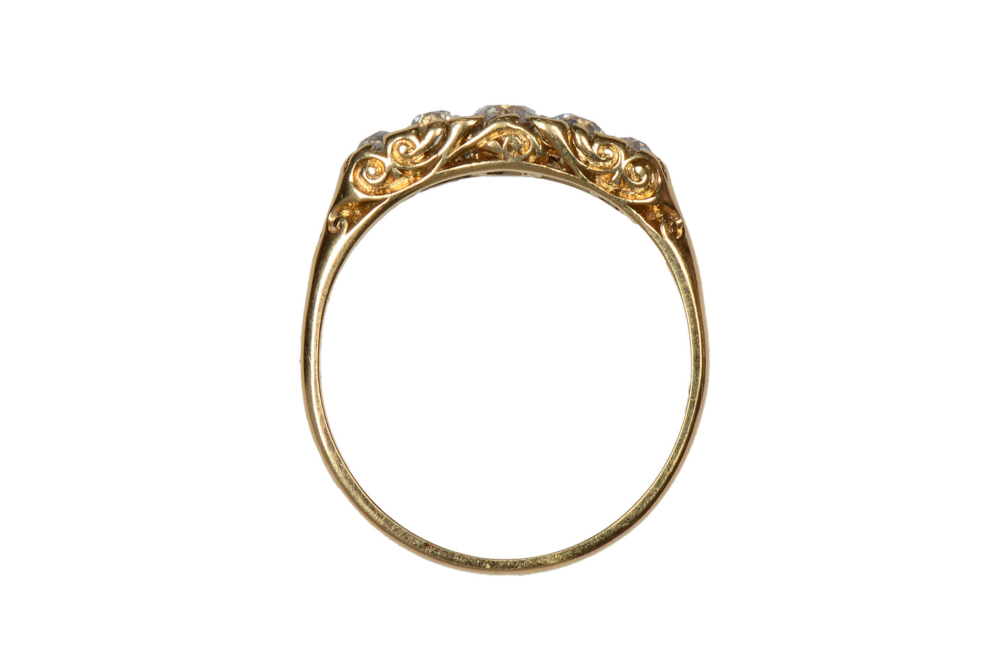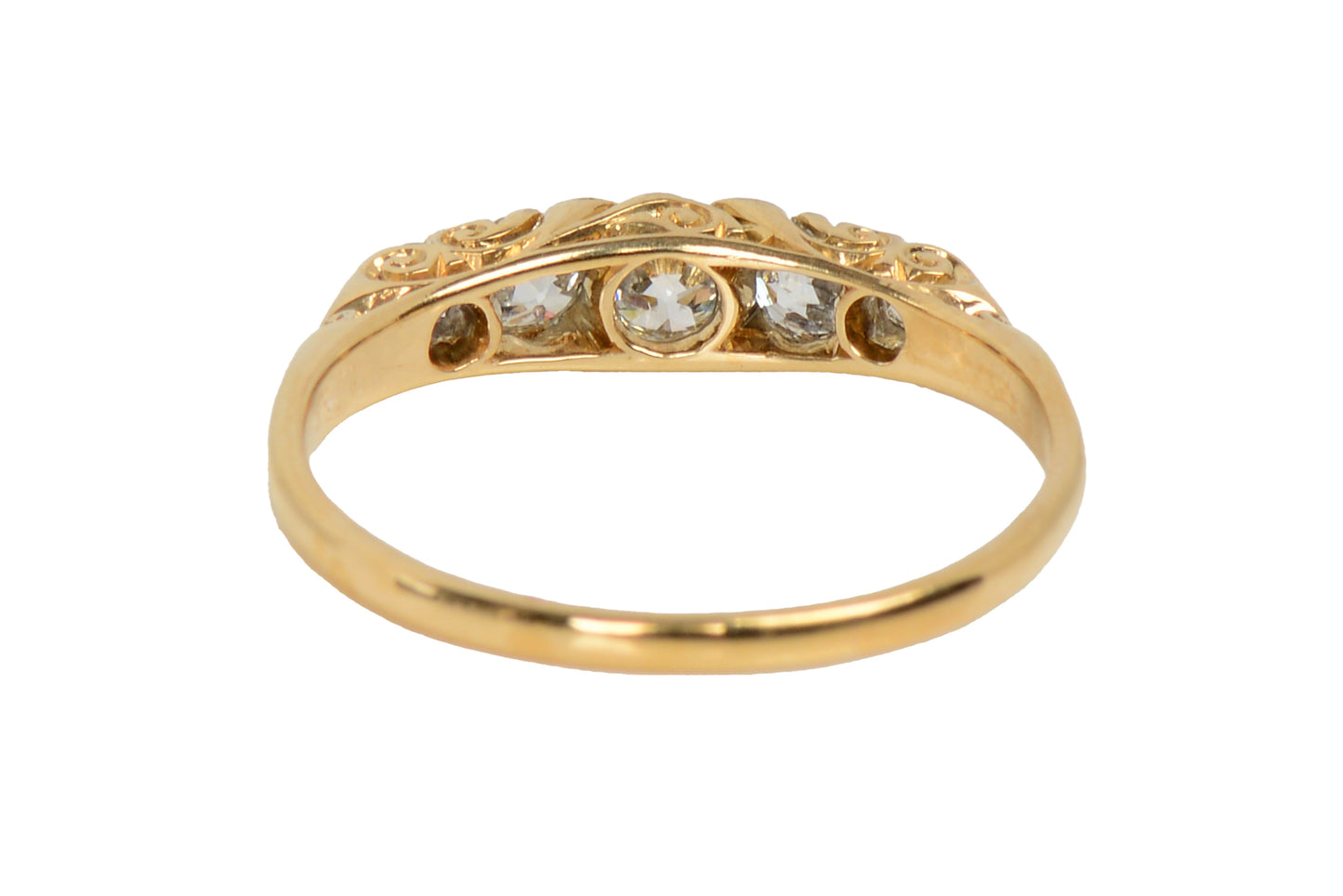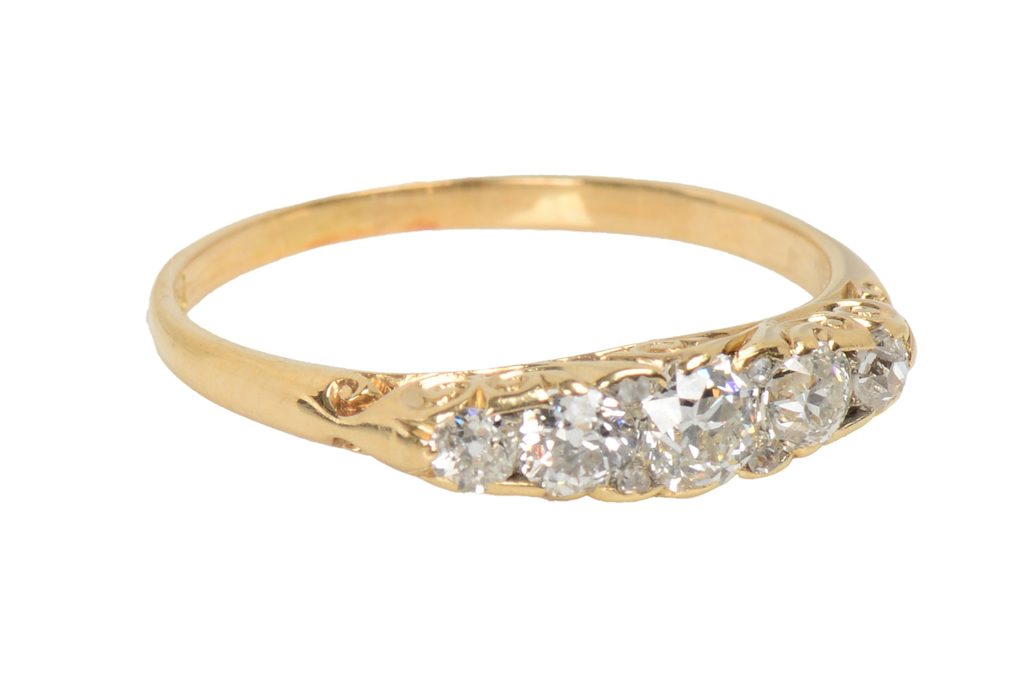 Eco-friendly and conflict-free, this English Edwardian antique ring arranges five old European brilliant-cut diamonds across the finger east and west. Every offering at The Three Graces is handpicked to ensure the diamonds are clear, white, and shimmering.