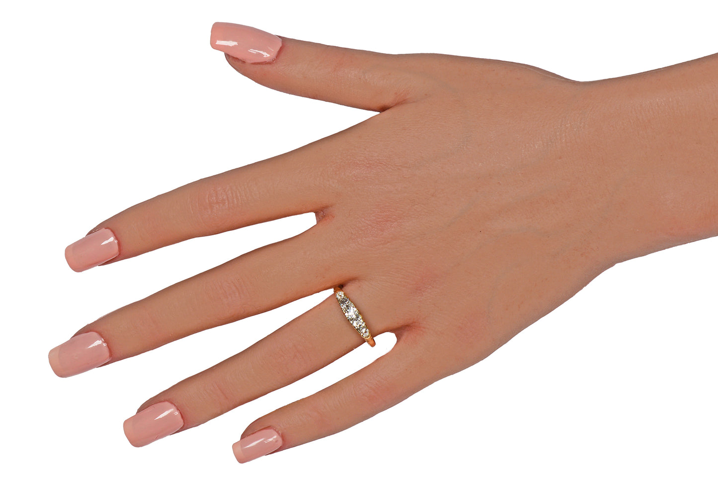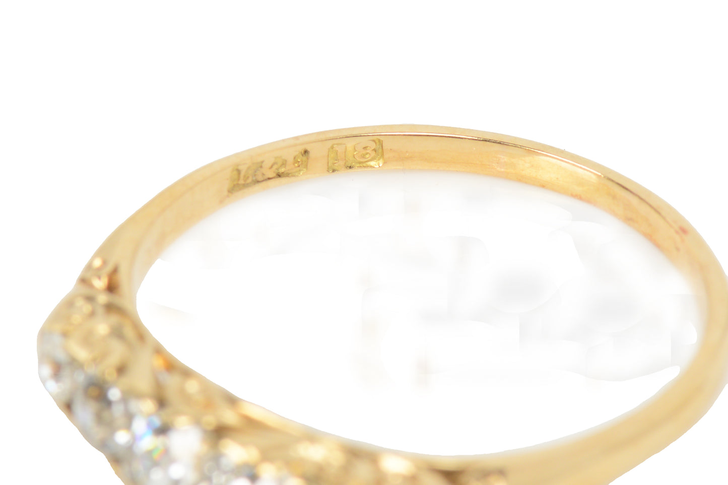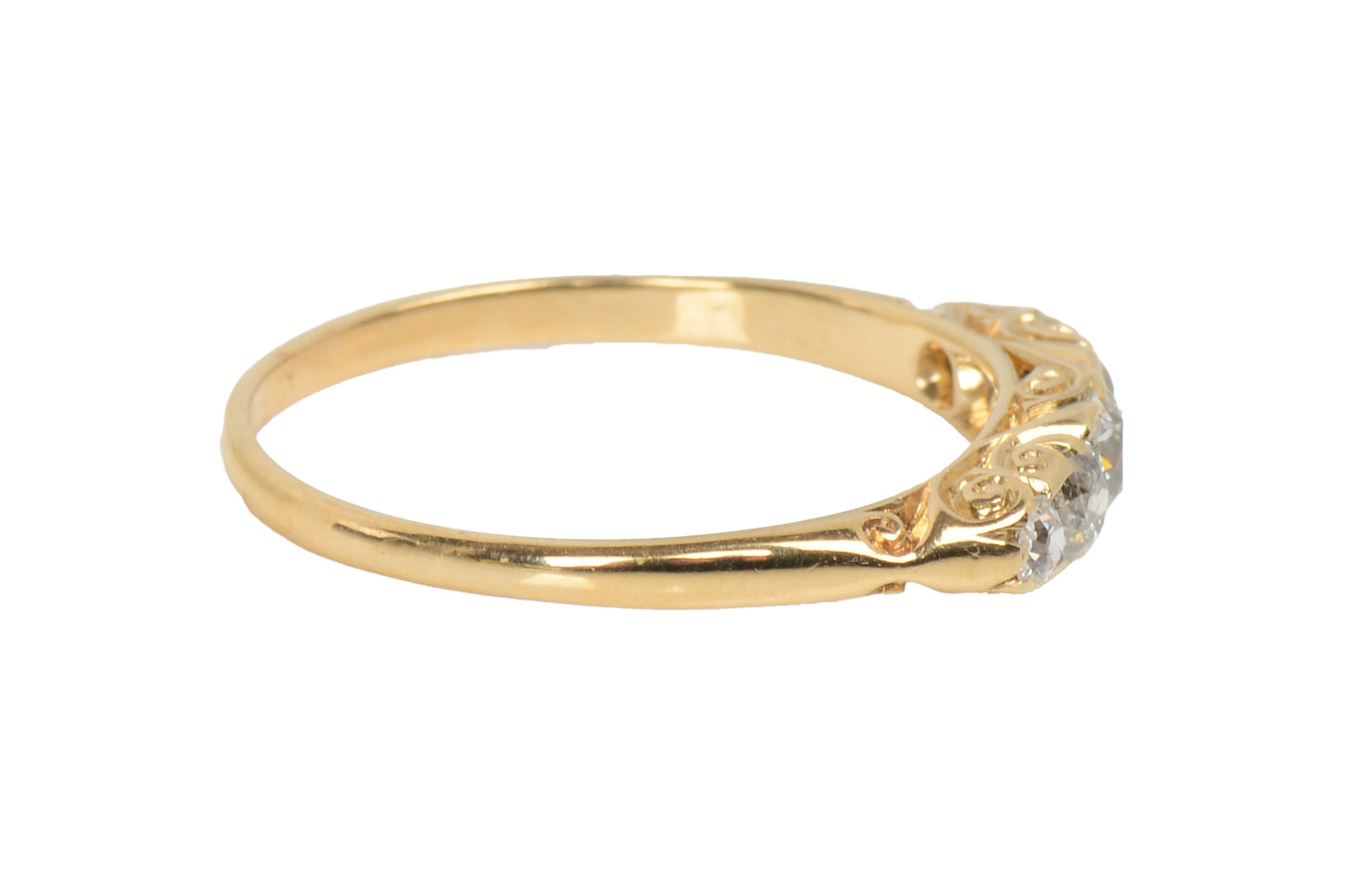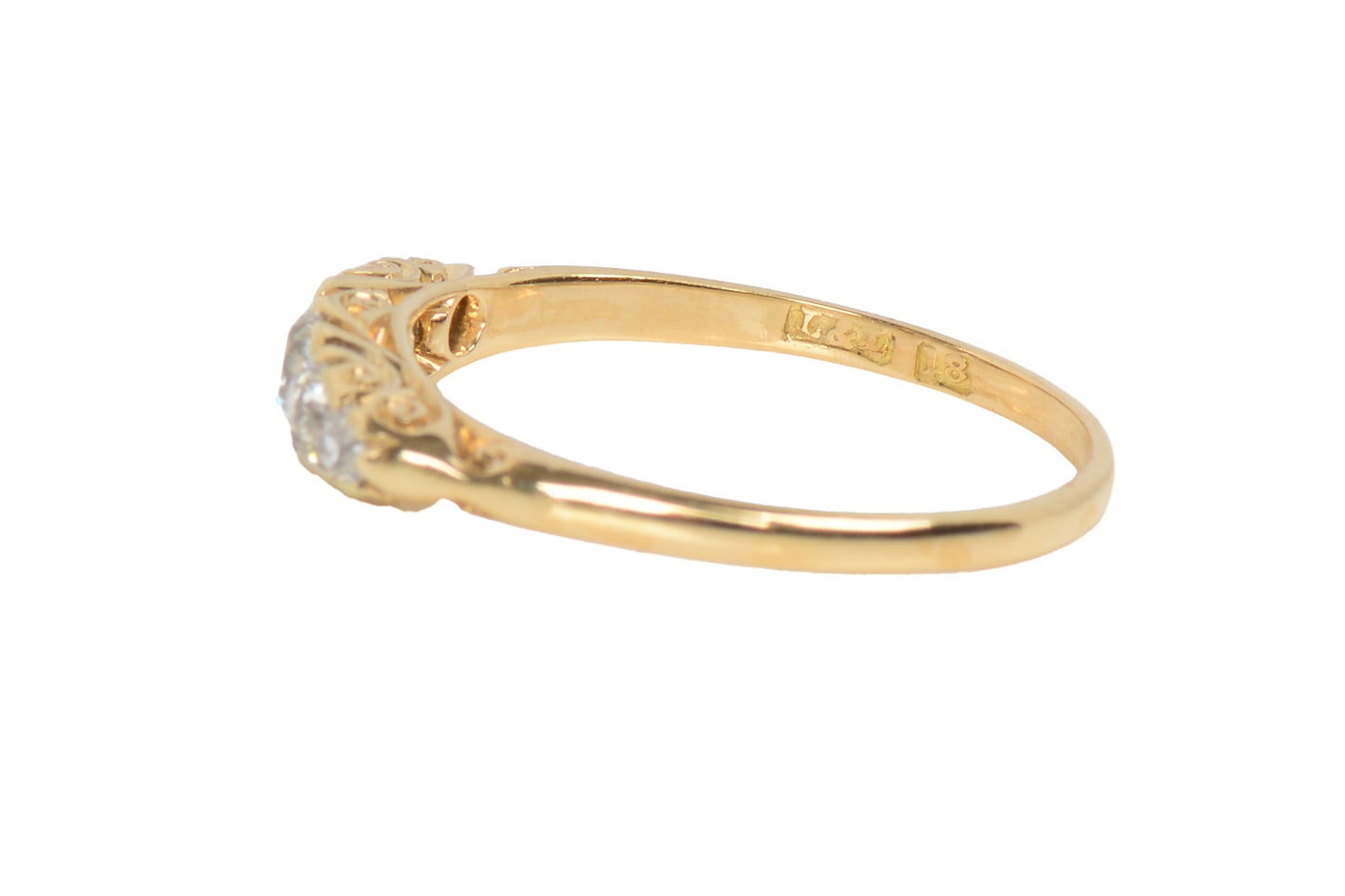 Eco-friendly and conflict-free, this English Edwardian antique ring arranges five old European brilliant-cut diamonds across the finger east and west. Every offering at The Three Graces is handpicked to ensure the diamonds are clear, white, and shimmering.