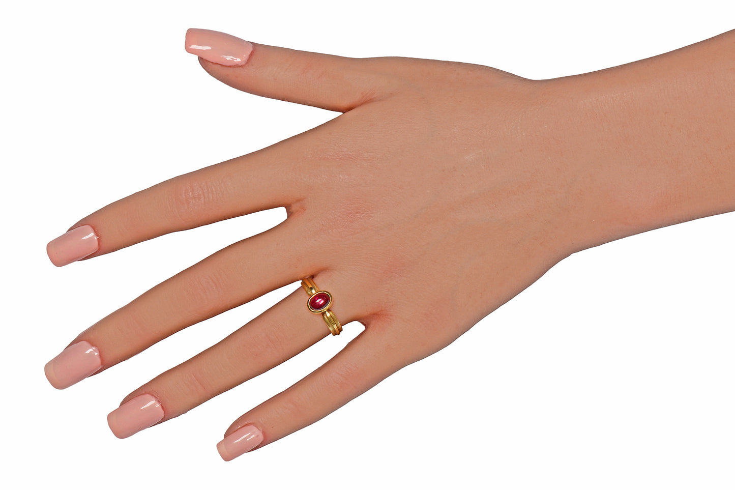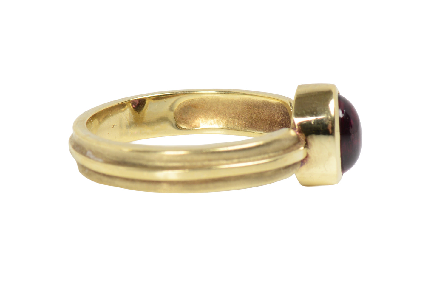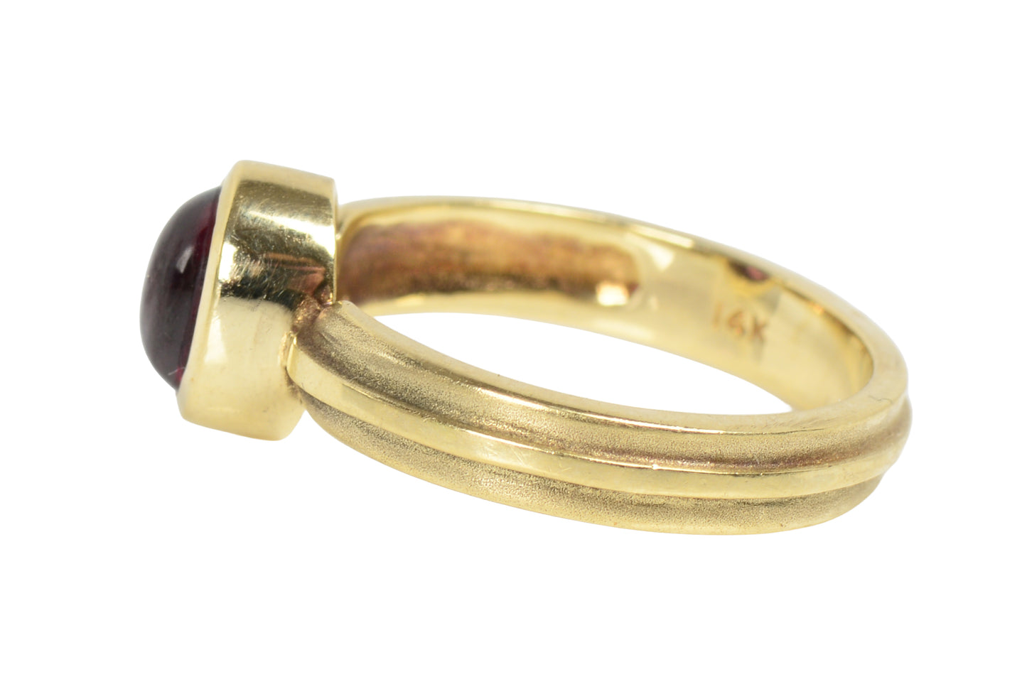 A plum pink oval cabochon garnet glows distinctly when worn. A shank that has a raised center "stripe" all the way around gives this a certain something.