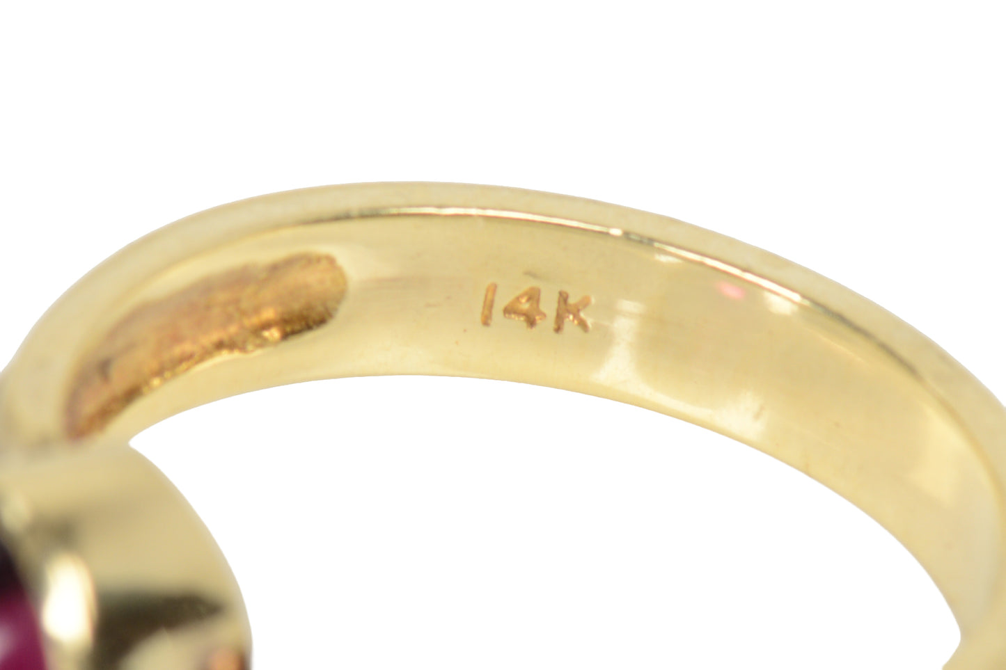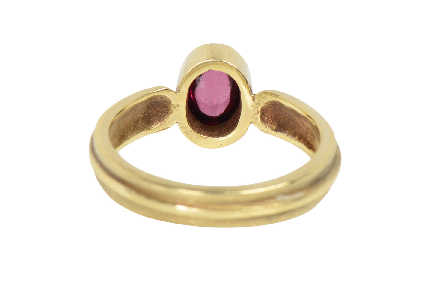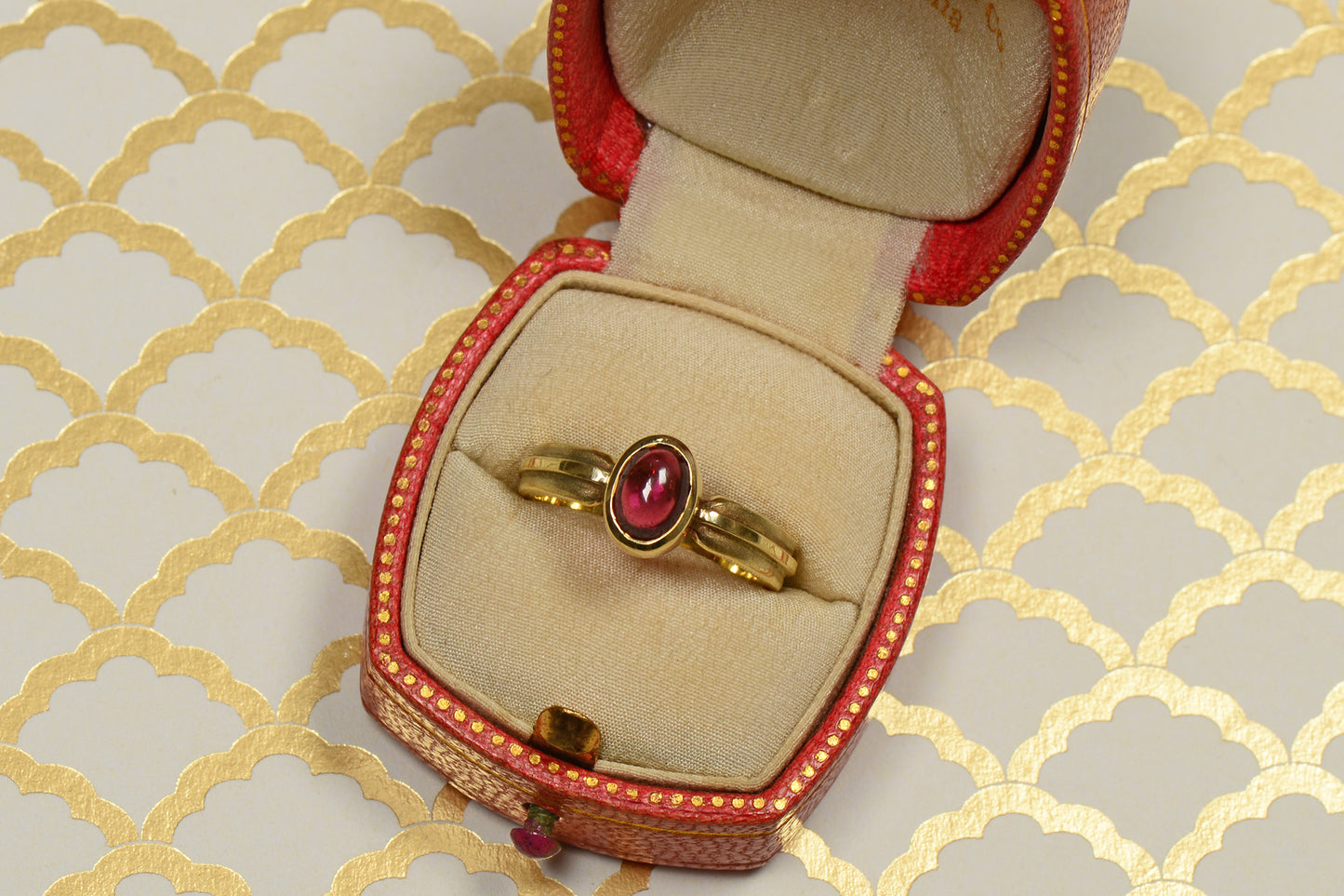 A plum pink oval cabochon garnet glows distinctly when worn. A shank that has a raised center "stripe" all the way around gives this a certain something.