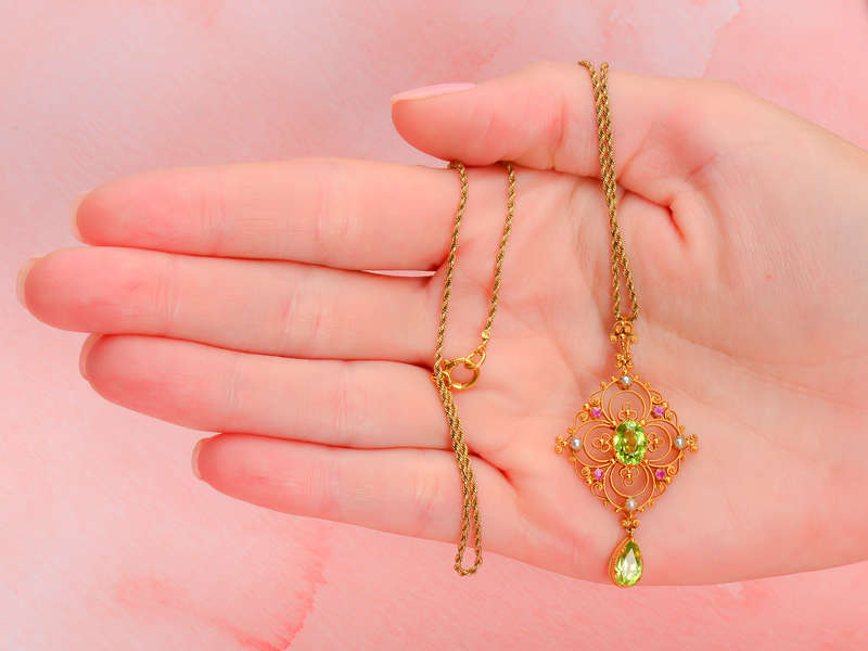 Far more than the sum of its parts, this 15k gold antique Edwardian antique pendant radiates an understated but distinct aura. Dotted with lively peridot gems, tiny rubies and four natural saltwater seed pearls, it appears almost unworn for its 120 plus years.