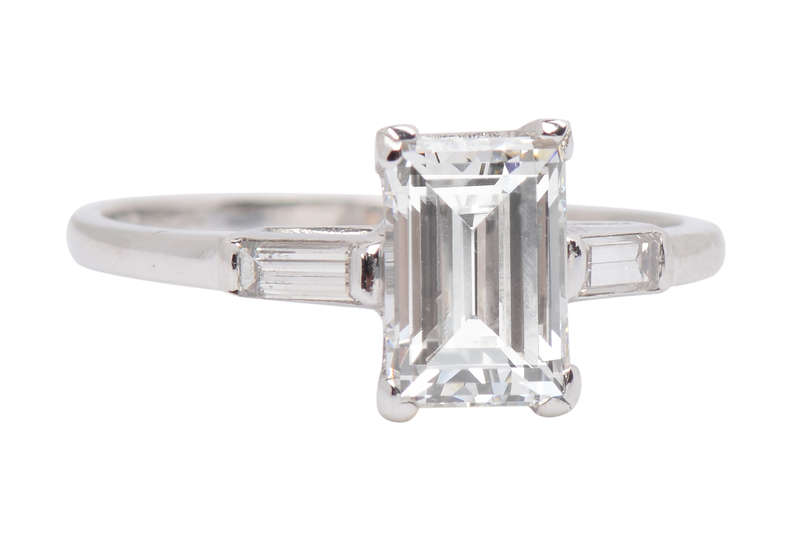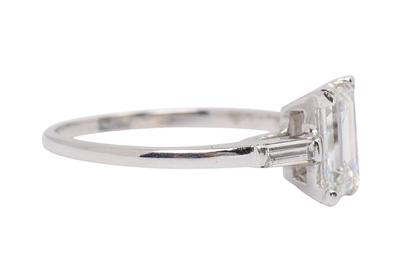 From 1959, and in platinum, the center diamond is a 1.32 carat, GIA certified, E-color diamond. Snowflake white is cut to maximize its pure color and prismatic refraction.