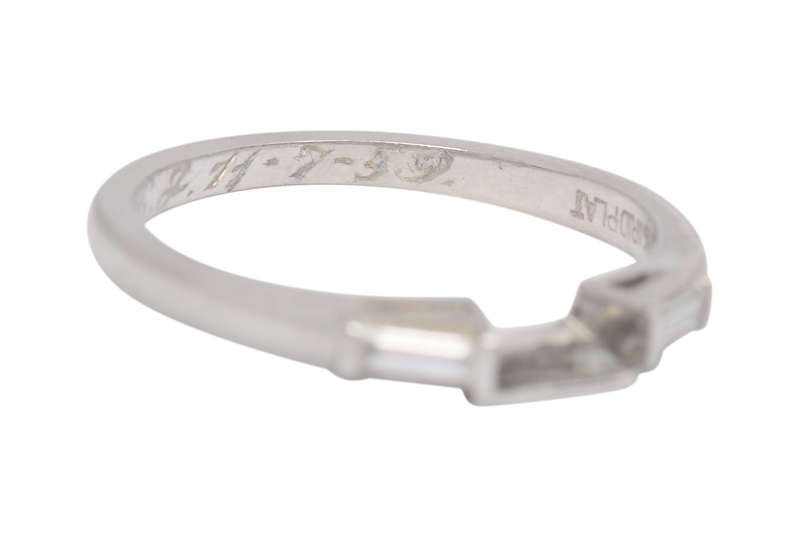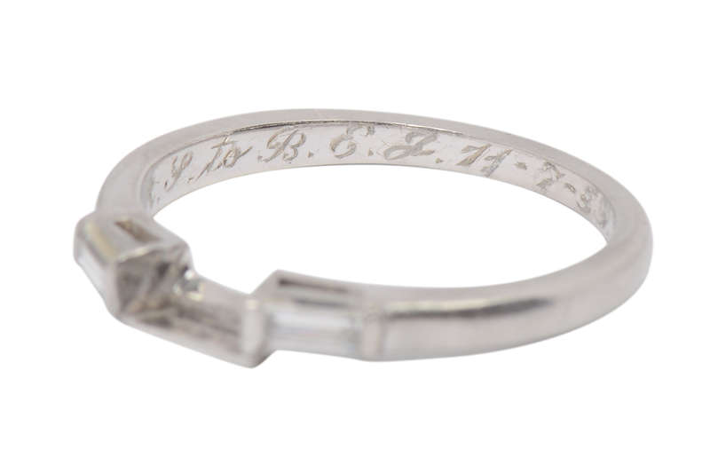 To the interior of the wedding band is hand-engraved in script, "H.R.S. to B.E.J. 11-7-59" for November 7, 1959.