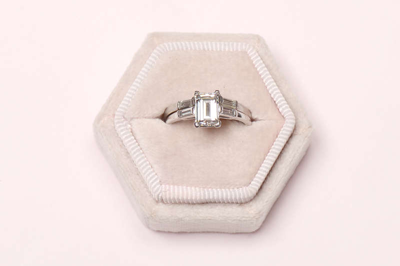 For a lifetime, behold this breathtaking emerald cut and baguette diamond wedding band and engagement ring set.