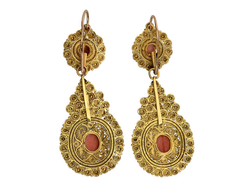 Coral, cannetille, and filigree wirework artistically fuse into an exceptional pair of Georgian-era earrings.